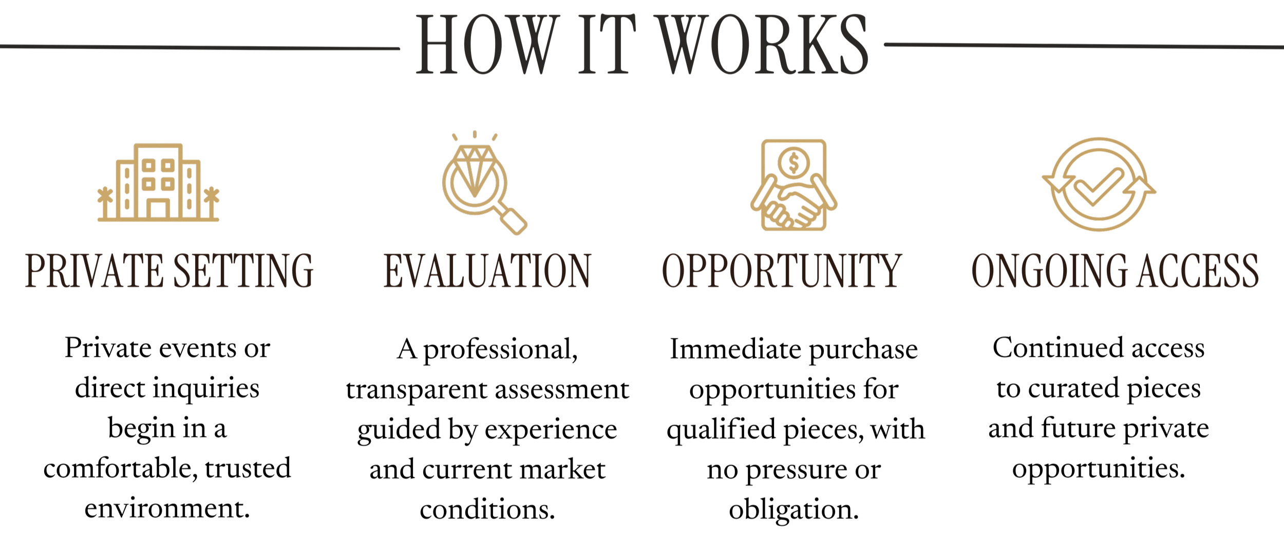 We believe the experience of evaluating and selling your valuables should feel as refined as the pieces themselves. Through thoughtfully hosted private events, we create a comfortable, trusted environment where clients can engage with confidence, clarity, and complete discretion.